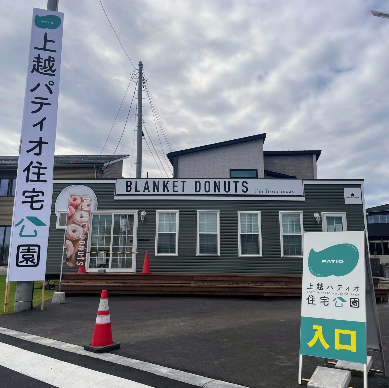 上越市富岡の上越ウイングマーケットセンターに新設された総合住宅展示場「上越パティオ住宅公園」内に、 「BLANKET DONUTS(ブランケットドーナツ)パティオ上越店」 が2025年9月20日(土)にオープンしました。