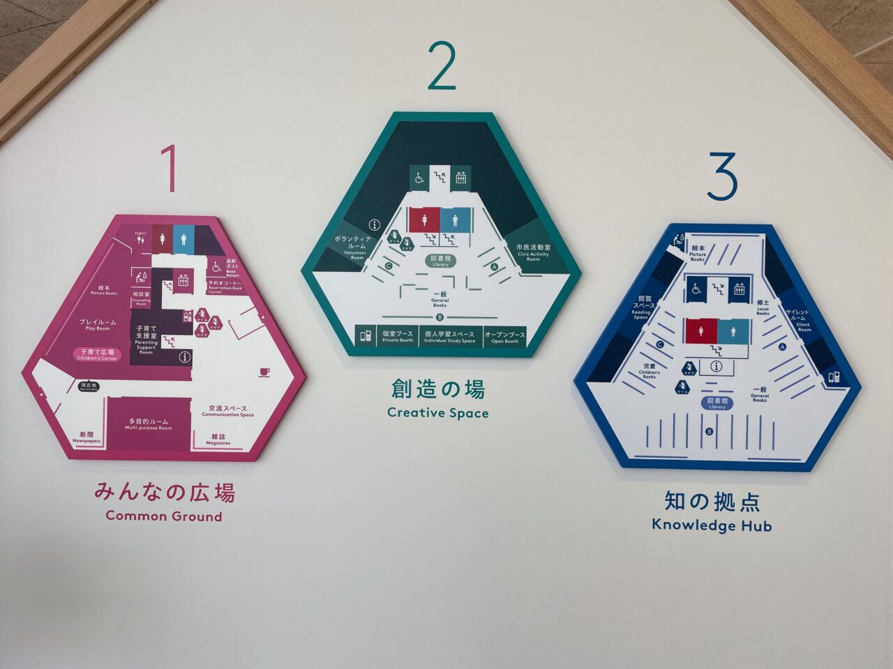 館内は、1階が「みんなの広場」、2階が「創造の場」、3階が「知の拠点」となっており、それぞれフロアごとに図書館や子育て広場、生涯学習、市民交流、カフェなど、まちの「便利」が集まった複合施設です。