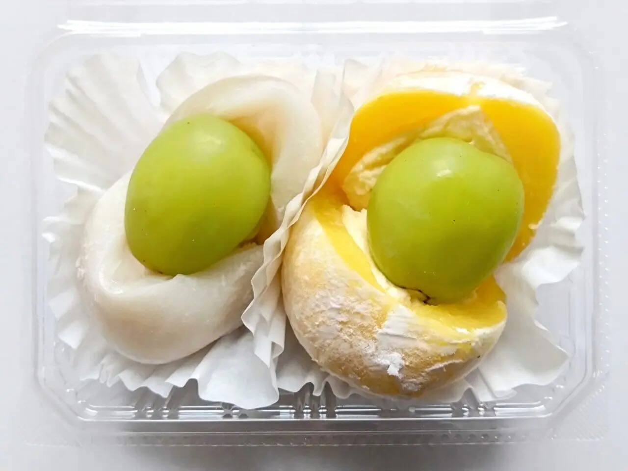 旬の大粒シャインマスカットを使用した「シャインマスカット大福」は、定番の「白あん大福」にくわえ、「カスタードクリーム大福」の2種類の味をご用意。
