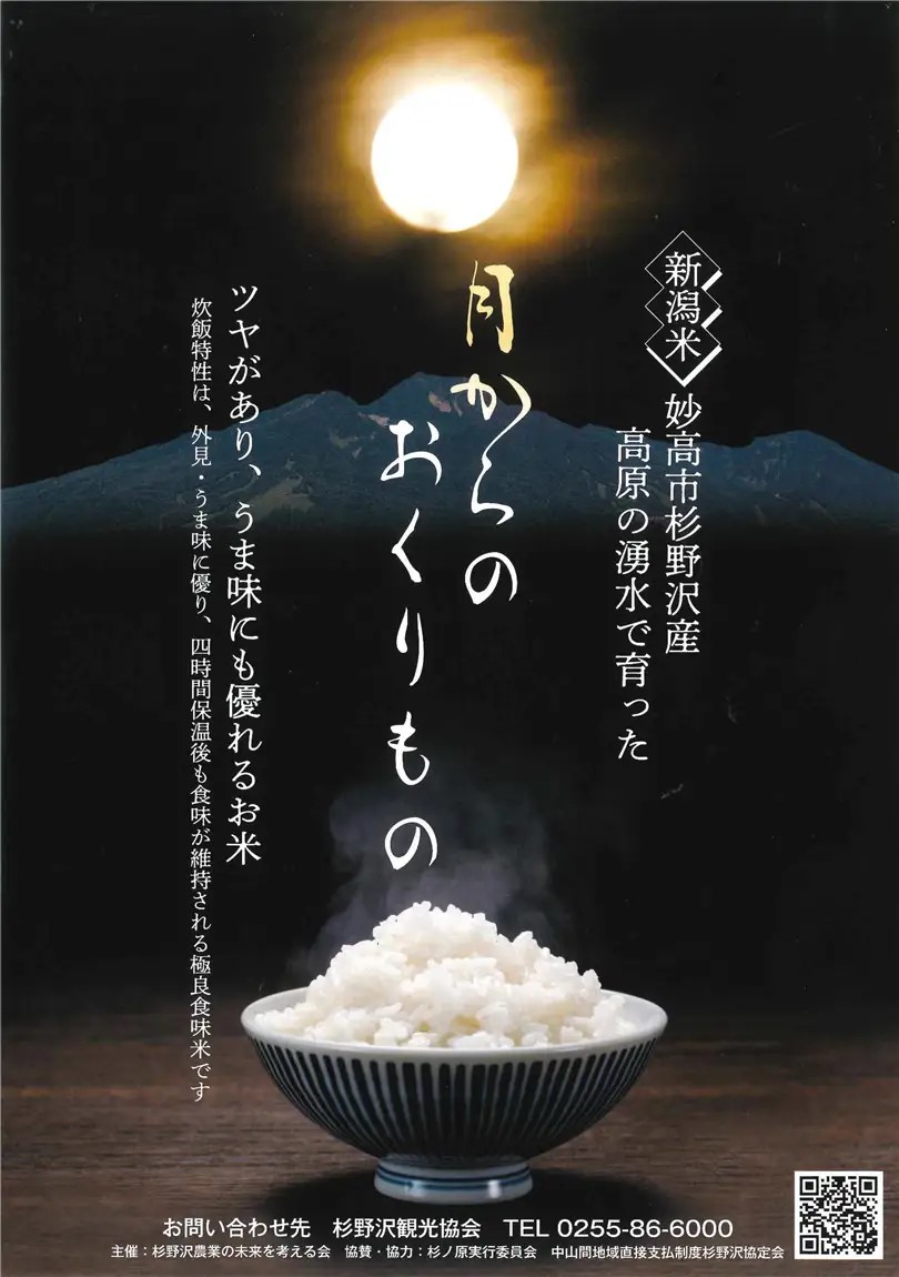 キノコ汁の振る舞い(数量限定)、杉野沢産ブランド米「月からのおくりもの」の販売を実施します。