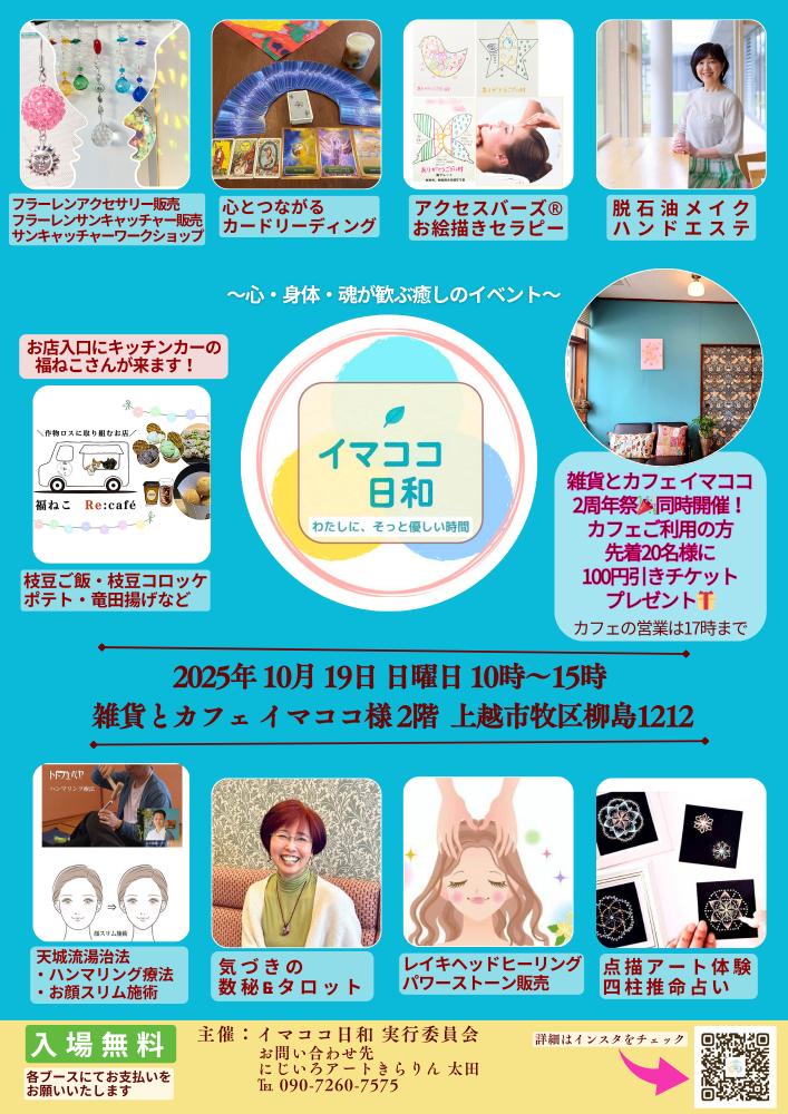 上越市牧区にある「雑貨とカフェ イマココ」にて、2025年10月19日(日)、「第2回イマココ日和 マルシェ」が開催されます。このイベントは、癒し、美容、占い、ワークショップなど、心と体を整える8店舗が出店します。