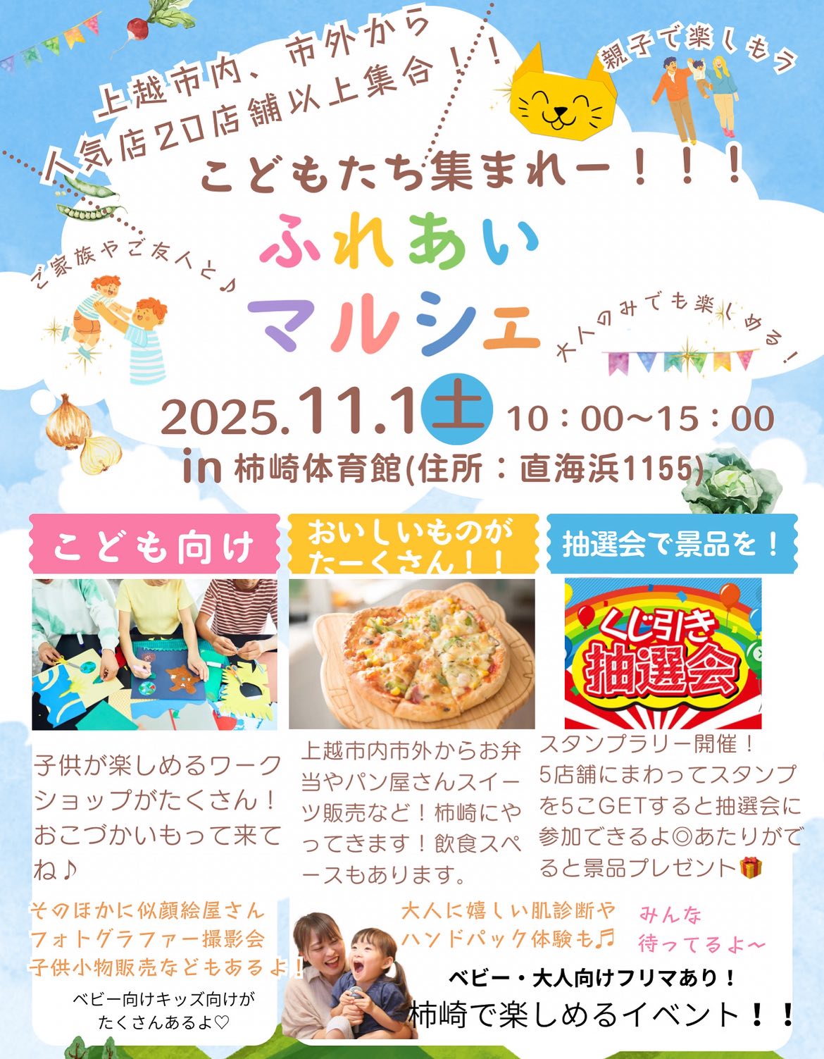 上越市柿崎区の柿崎体育館にて、2025年11月1日(土)、子どもも大人も楽しめる「ふれあいマルシェ」が開催されます。今回初めての柿崎区での開催となり、取り壊しが決まっている柿崎体育館での最後の思い出づくりとしてもぴったりのイベントです。