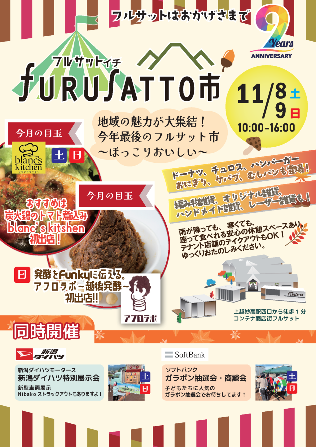 上越妙高駅西口のコンテナ商店街「フルサット」にて、2025年11月8日(土)・9日(日)の2日間、恒例の「フルサット市」が開催されます。