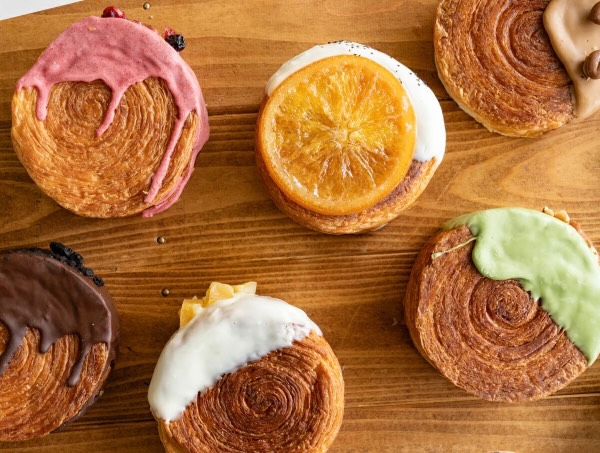 京都の本格抹茶が香る看板商品「抹茶大納言デニッシュ」をはじめ、まるでアップルパイのような贅沢さの「シナモンりんごデニッシュ」、幅広い層から人気の「ショコラーデ」「メープル」など、多彩なデニッシュが登場します。