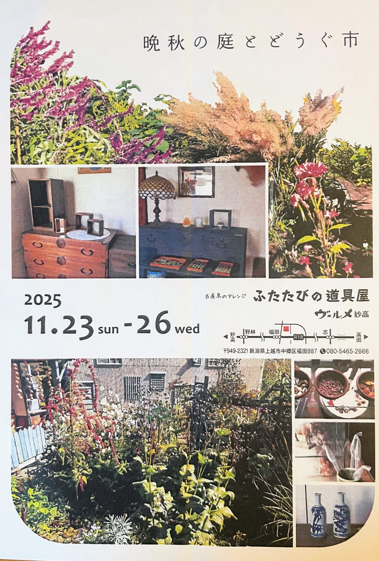 上越市中郷区の「ふたたびのどうぐ家・ヴェルメ妙高」にて、2025年11月23日(日)〜26日(水)の4日間、「晩秋の庭とどうぐ市」を開催しています。