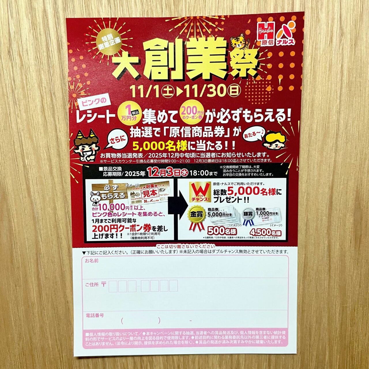 地域のスーパーマーケット「原信ナルス」では、2025年11月1日(土)〜30日(日)の期間中、ピンクのレシートを税込1万円分集めると200円分のクーポン券が必ずもらえる「大創業祭」を開催しています。(複数枚のレシート合計で応募可)