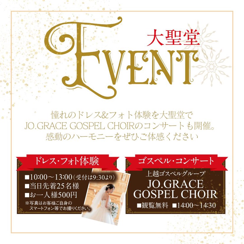 今回は、大聖堂でのドレス&フォト体験や上越を拠点に活動する「JO.GRACE GOSPEL CHOIR」による無料コンサートも開催されます。