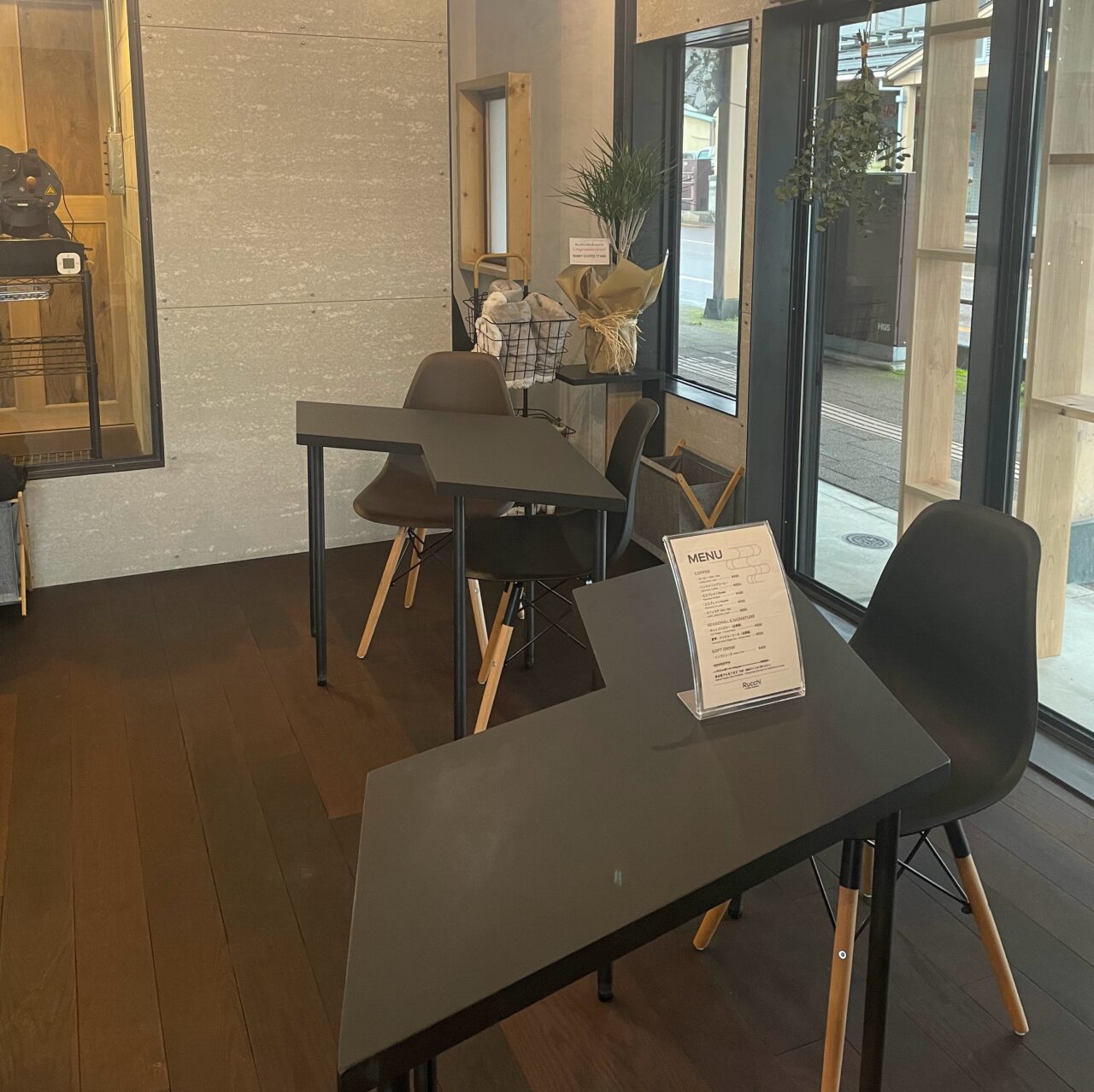 店内には、カウンター2席とテーブル席が2つあり、シックでおしゃれな空間が広がっています。内装は、店主さんの地元・福井県から職人さんを呼んで手がけてもらったそうで、妙高市ではなかなか味わえない雰囲気も魅力のひとつです。
