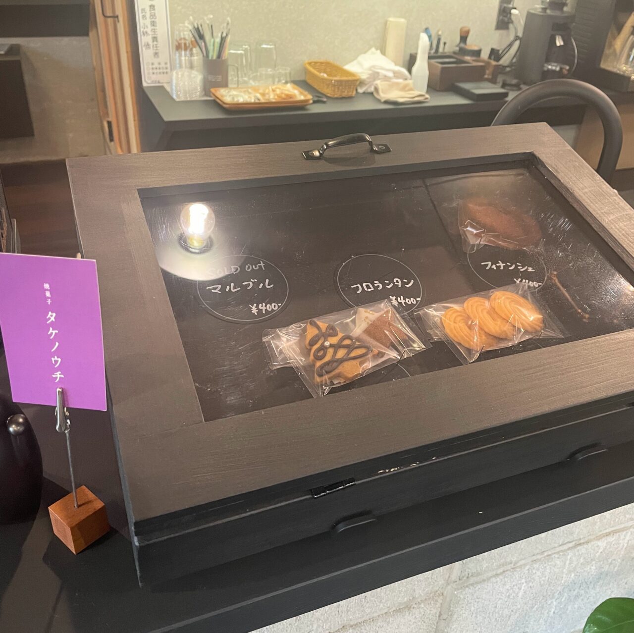 また、コーヒーのお供には、地元・福井県のお菓子屋さん「焼菓子 タケノウチ」による焼き菓子を販売しています。あわら市産の福地鶏の卵を使用したこだわりの焼き菓子で、こちらも種類は随時変わる予定です。