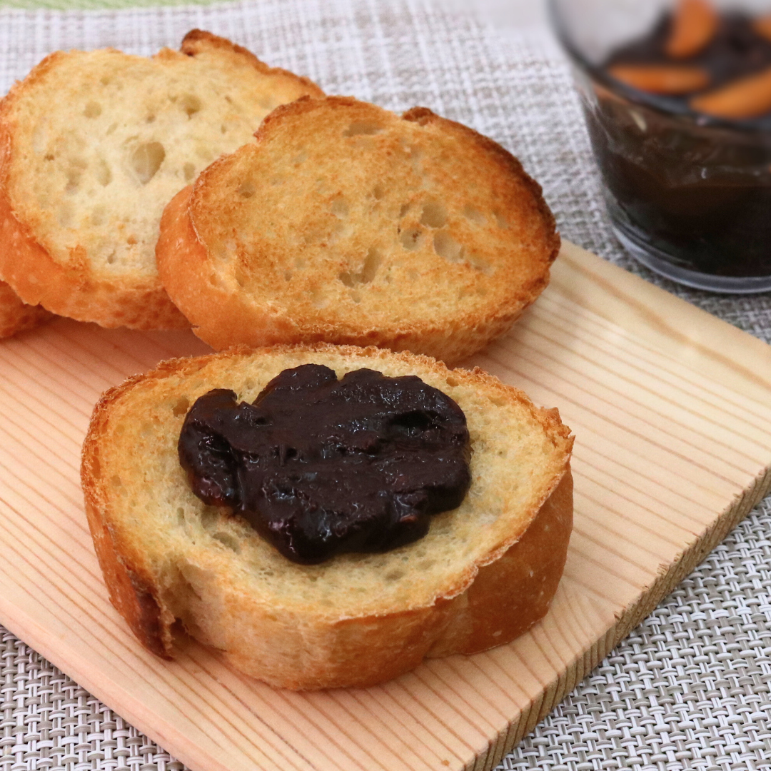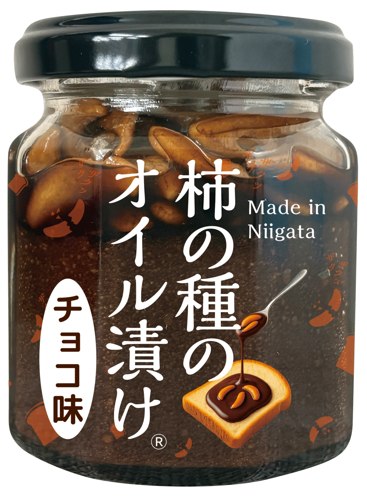 阿部幸製菓株式会社の人気商品「柿の種のオイル漬け」シリーズ。「ご飯にのせる」から「パンにのせる」という新たなコンセプトで誕生した商品が、「パンにのせる柿の種のオイル漬け チョコ味」です。