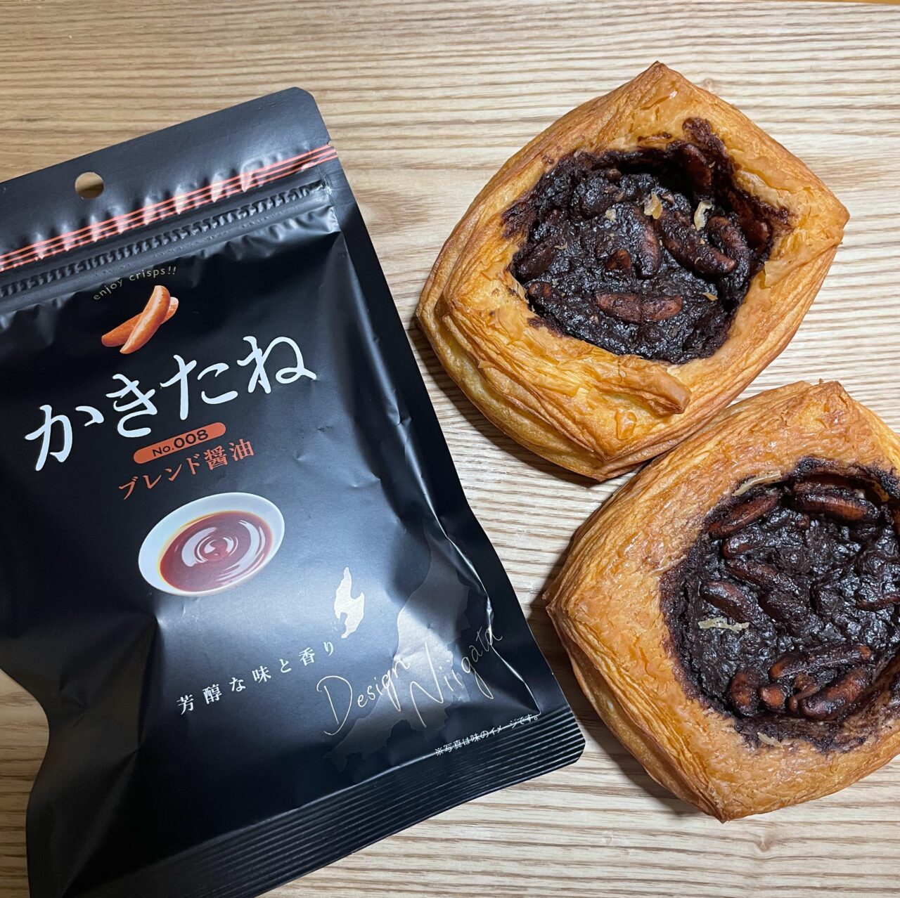 「柿の種チョコクリームデニッシュ」お買い上げで「かきたねブレンド醤油」プレゼント(各店一日30袋限定)