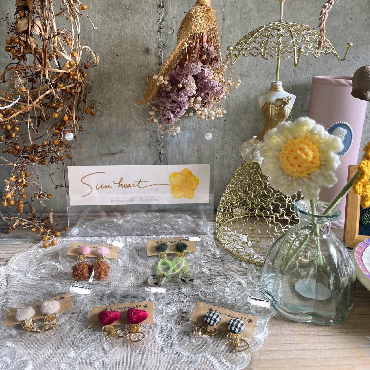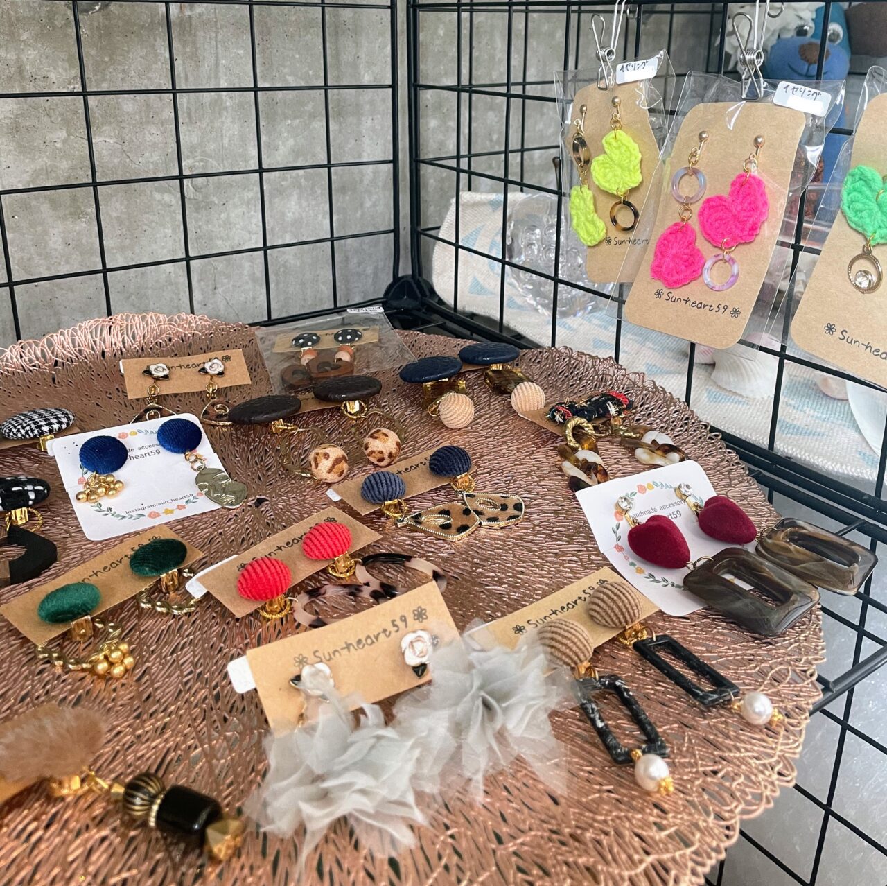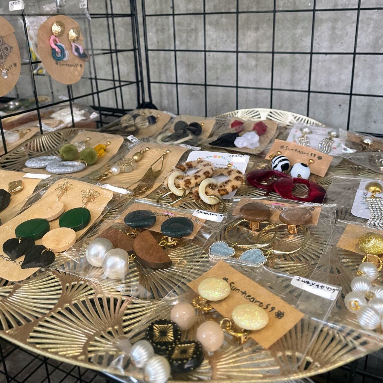 室内には、ピアスやイヤリングをはじめ、ターバン、ヘアゴム、ヘアピンなど、見ているだけで楽しい気持ちになる作品がずらりと並んでいます。