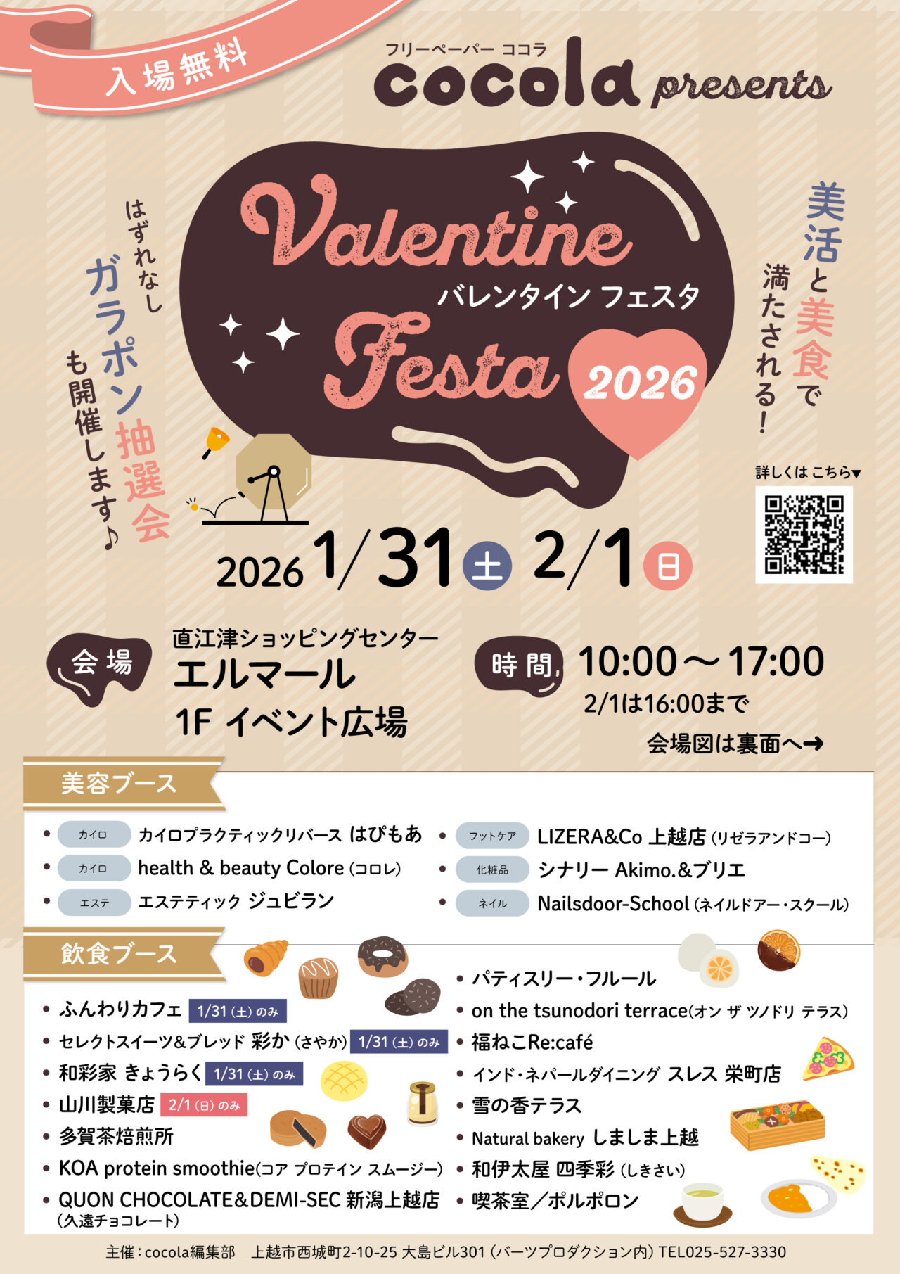 上越市西本町の直江津ショッピングセンター エルマールにて、2026年1月31日(土)・2月1日(日)の2日間、美活と美食で満たされる「Valentine Festa(バレンタイン フェスタ)2026」が開催されます。