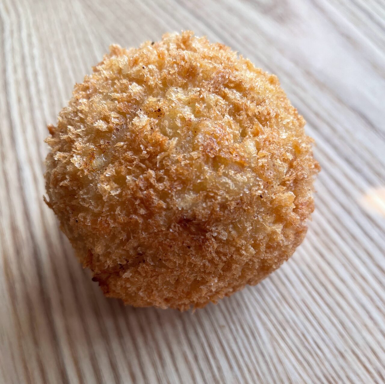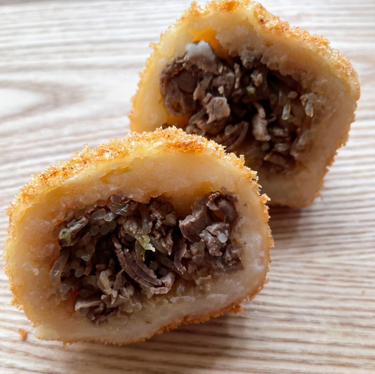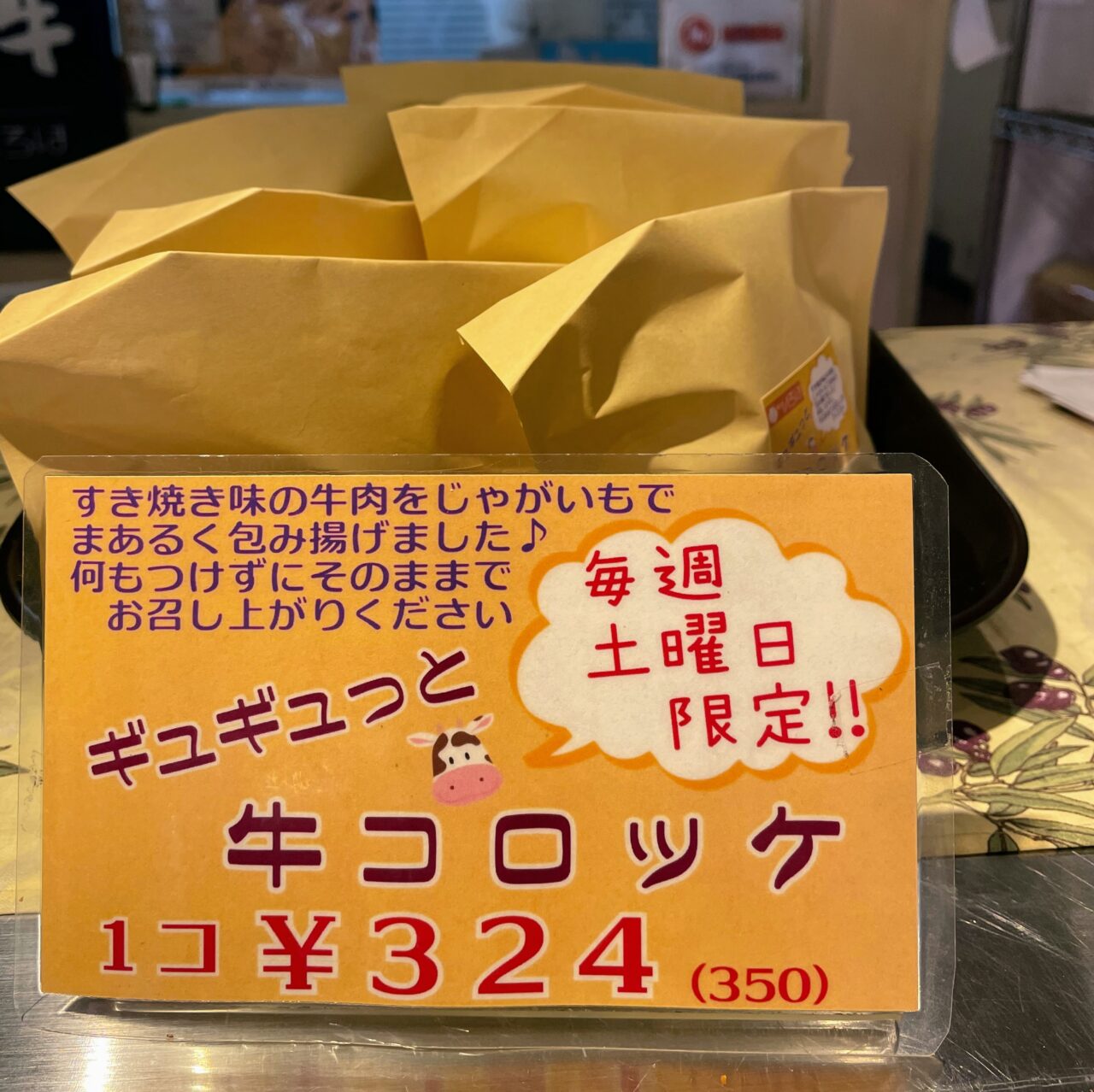 毎週土曜日限定で販売される「牛コロッケ」は、すき焼き味に仕上げた牛肉を、ほくほくのじゃがいもで丸く包んで揚げたボリューム満点の一品です。