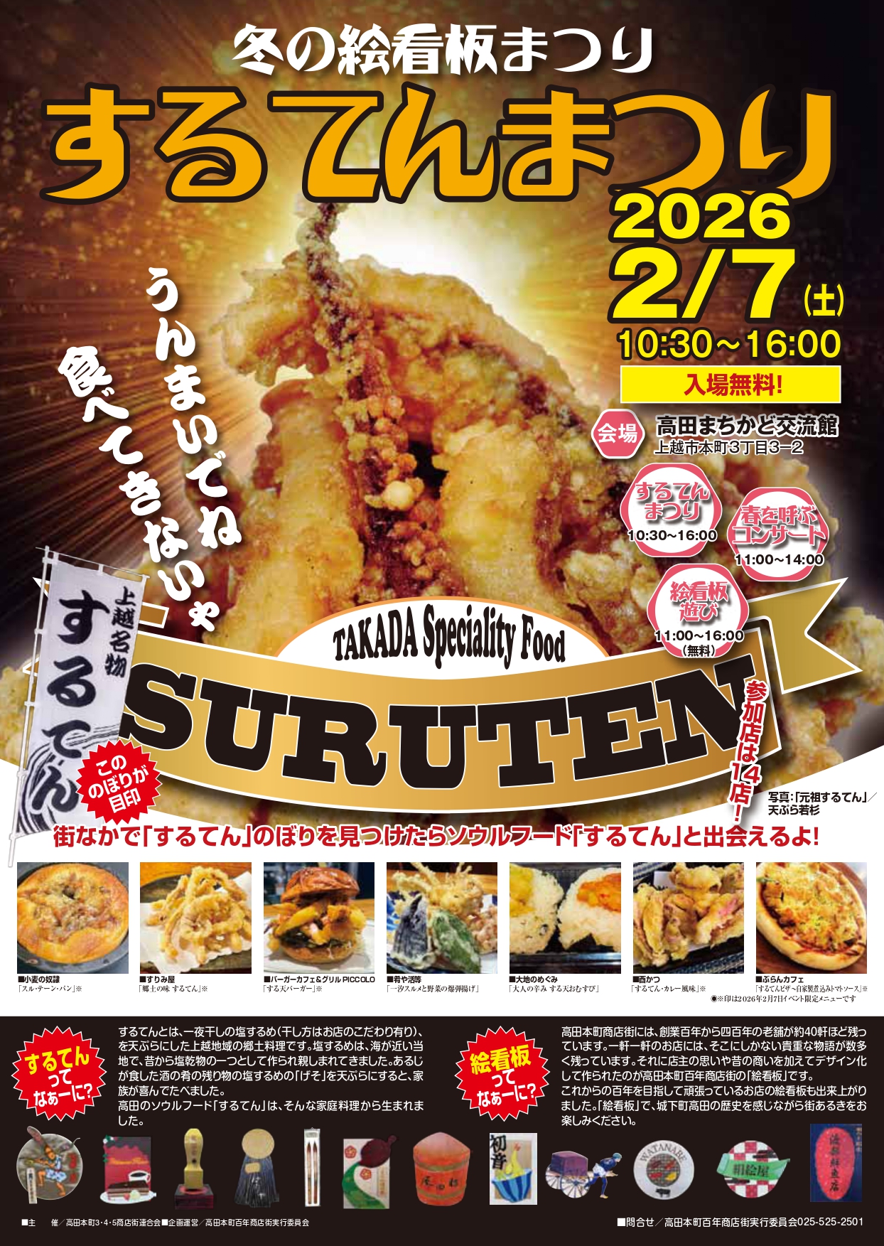 上越市本町3丁目の高田まちかど交流館および本町通りにある14店舗の参加店を会場に、2026年2月7日(土)、高田のソウルフード「するてん」と出会える「冬の絵看板まつり するてんまつり」が開催されます。