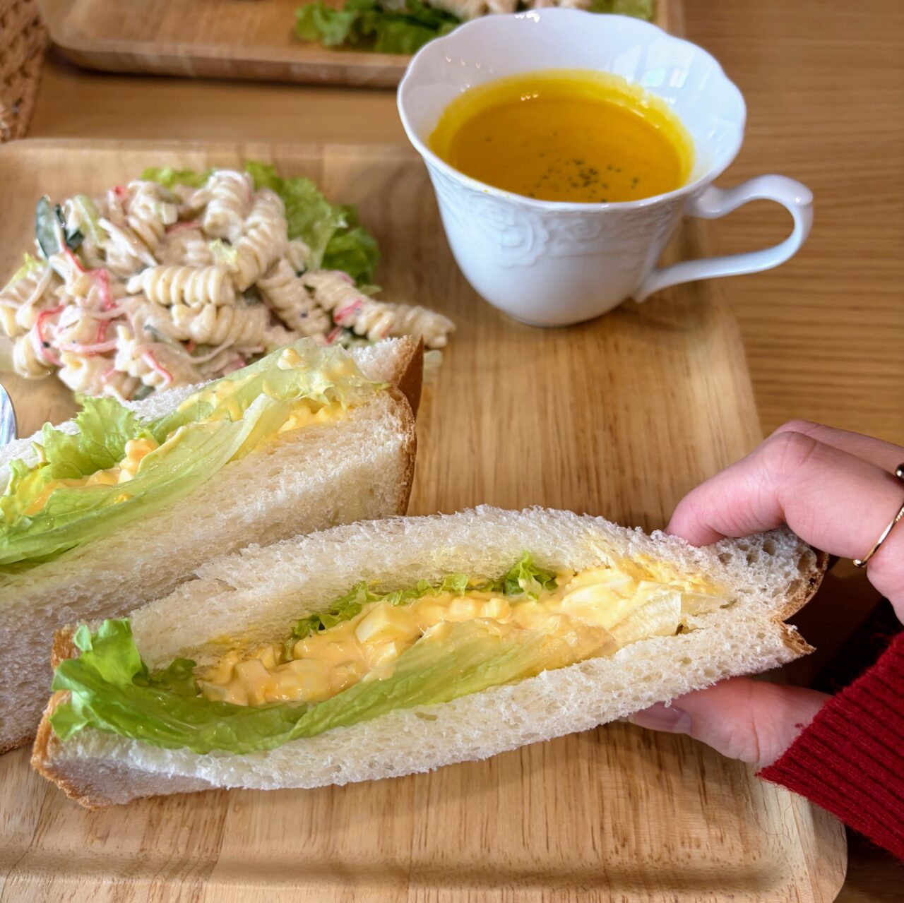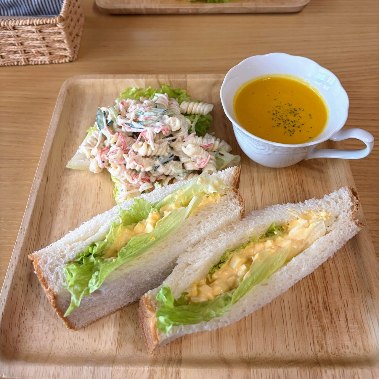 ランチは日替わりで、この日は「たまごサンド・マカロニサラダ・かぼちゃのポタージュ」のセットメニューでした。