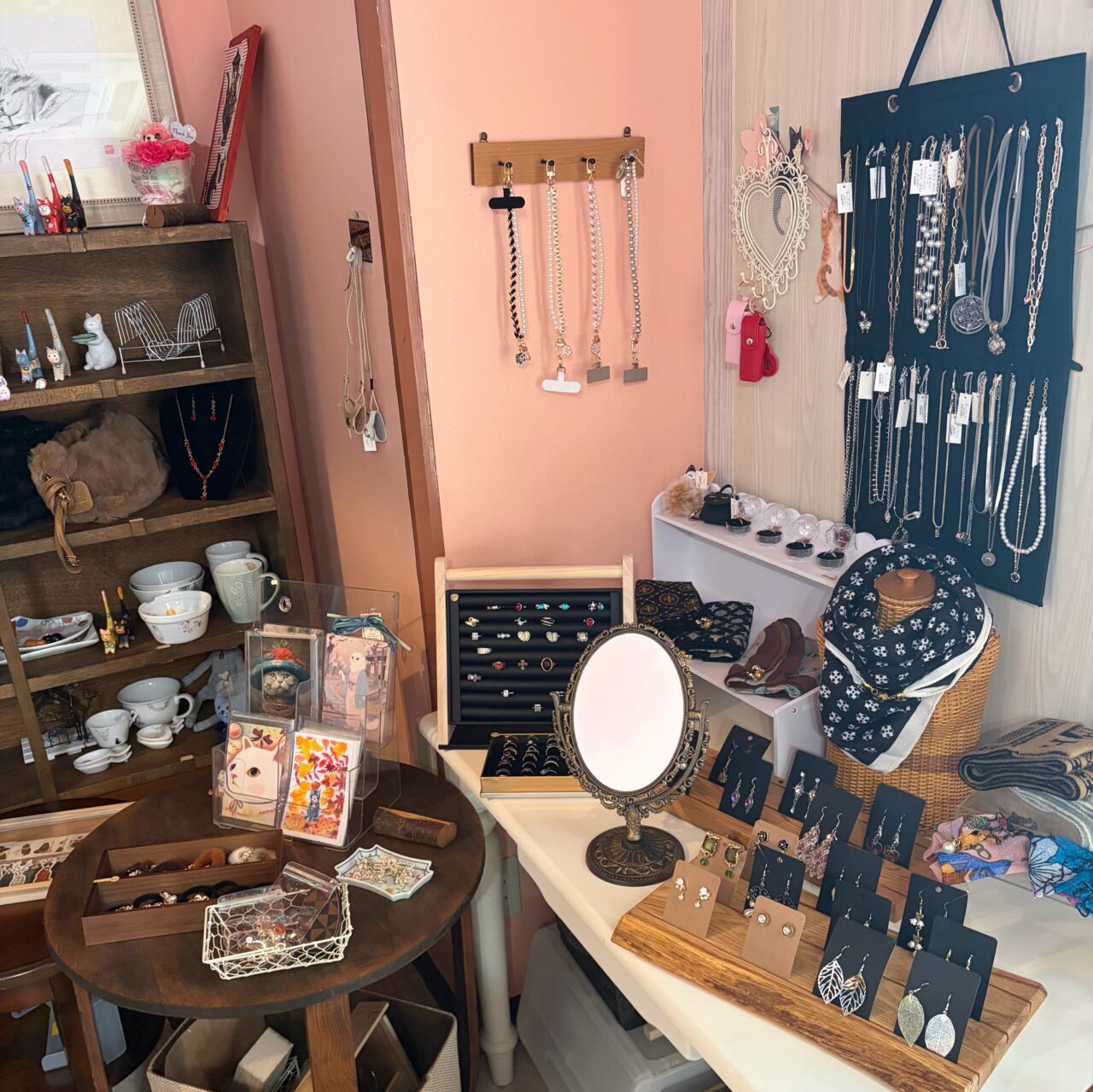 また、入口スペースではアクセサリーや雑貨の販売も行っており、裁縫教室などのワークショップ会場として使われることもあるそうです。