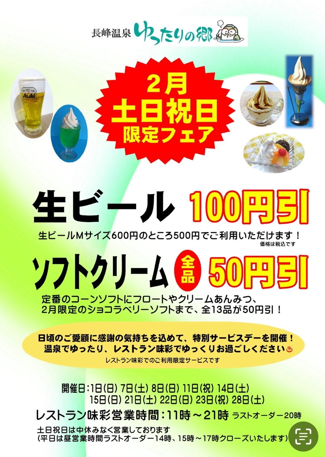 上越市吉川区にある日帰り温泉施設「長峰温泉 ゆったりの郷」内のレストラン味彩では、日頃のご愛顧に感謝を込めて、2月の土日祝日限定フェアを開催します。