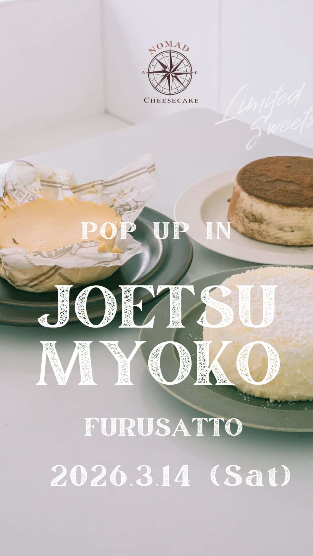 上越妙高駅西口から徒歩1分のコンテナ商店街「フルサット」に、2026年3月14日(土)、店舗を持たないチーズケーキ専門店「NOMAD CHEESECAKE(ノマドチーズケーキ)」が再びやってきます。