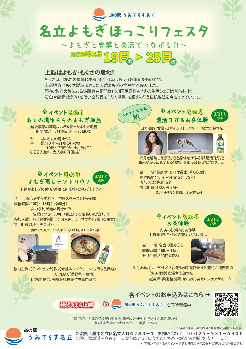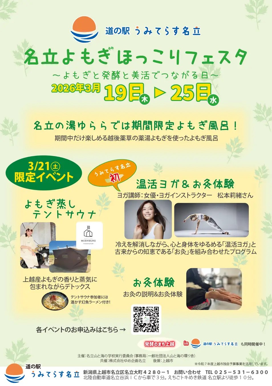 上越市名立区の「道の駅 うみてらす名立」にて、2026年3月19日(木)~3月25日(水)の期間、「名立よもぎほっこりフェスタ~よもぎと発酵と美活でつながる日~」が開催されます。
