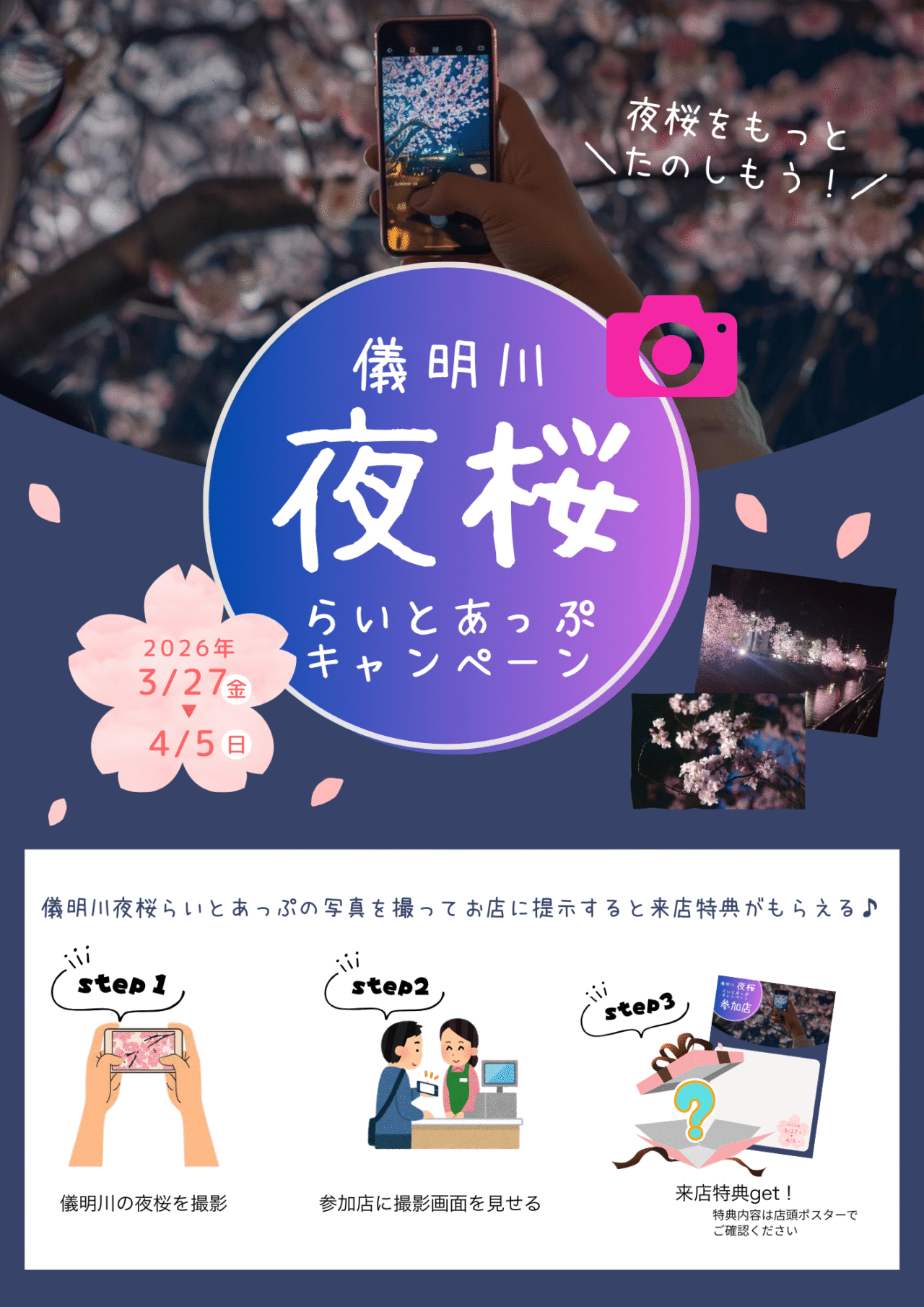 また今回は、イベント期間中に夜桜を撮影し、その写真を高田エリアの参加店で提示すると来店特典がもらえる「高田の夜桜をもっと楽しもう! 儀明川夜桜らいとあっぷキャンペーン」も同時開催されます。参加店舗は、本町3・4・5丁目商店街および仲町エリアの28店舗です。特典内容は、各店舗の店頭ポスターをご確認ください(ホームページにマップあり)。