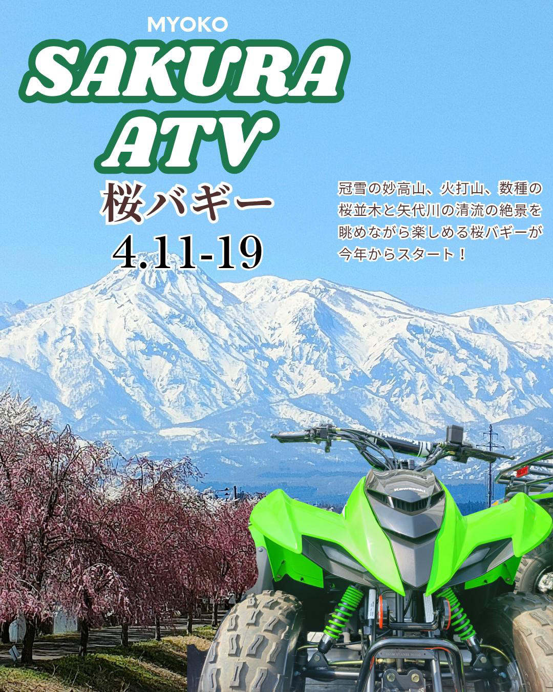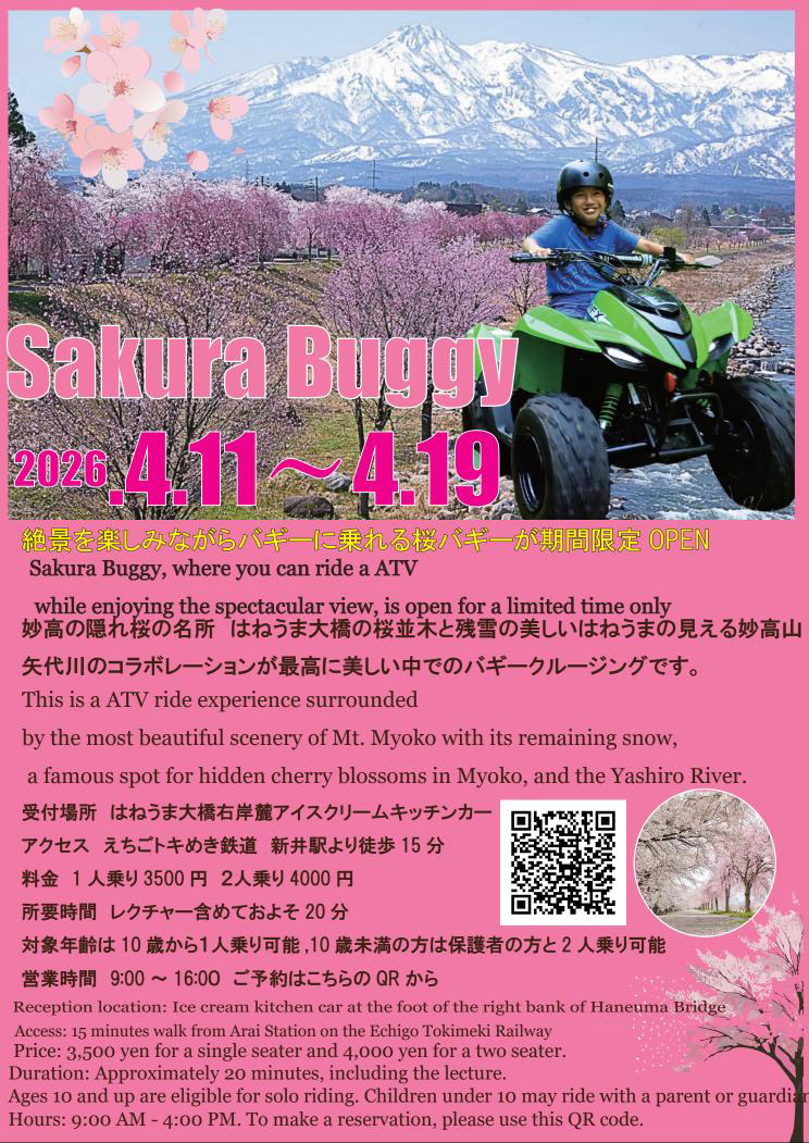 なかでも注目は、期間限定の桜バギーです。はねうま大橋の河川敷にて、Kawasakiの最新バギーに乗りながら桜並木と妙高山の絶景が楽しめる、新潟県内初の試みです。開催期間は、2026年4月11日(土)から19日(日)までの9:00〜16:00です。