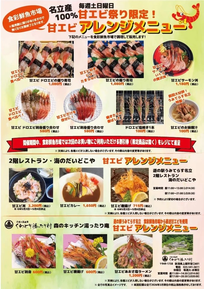このイベントでは、“名立産100%”の甘エビを使用した多彩なアレンジメニューが提供されるほか、参加型企画やお得な特典も用意されています。