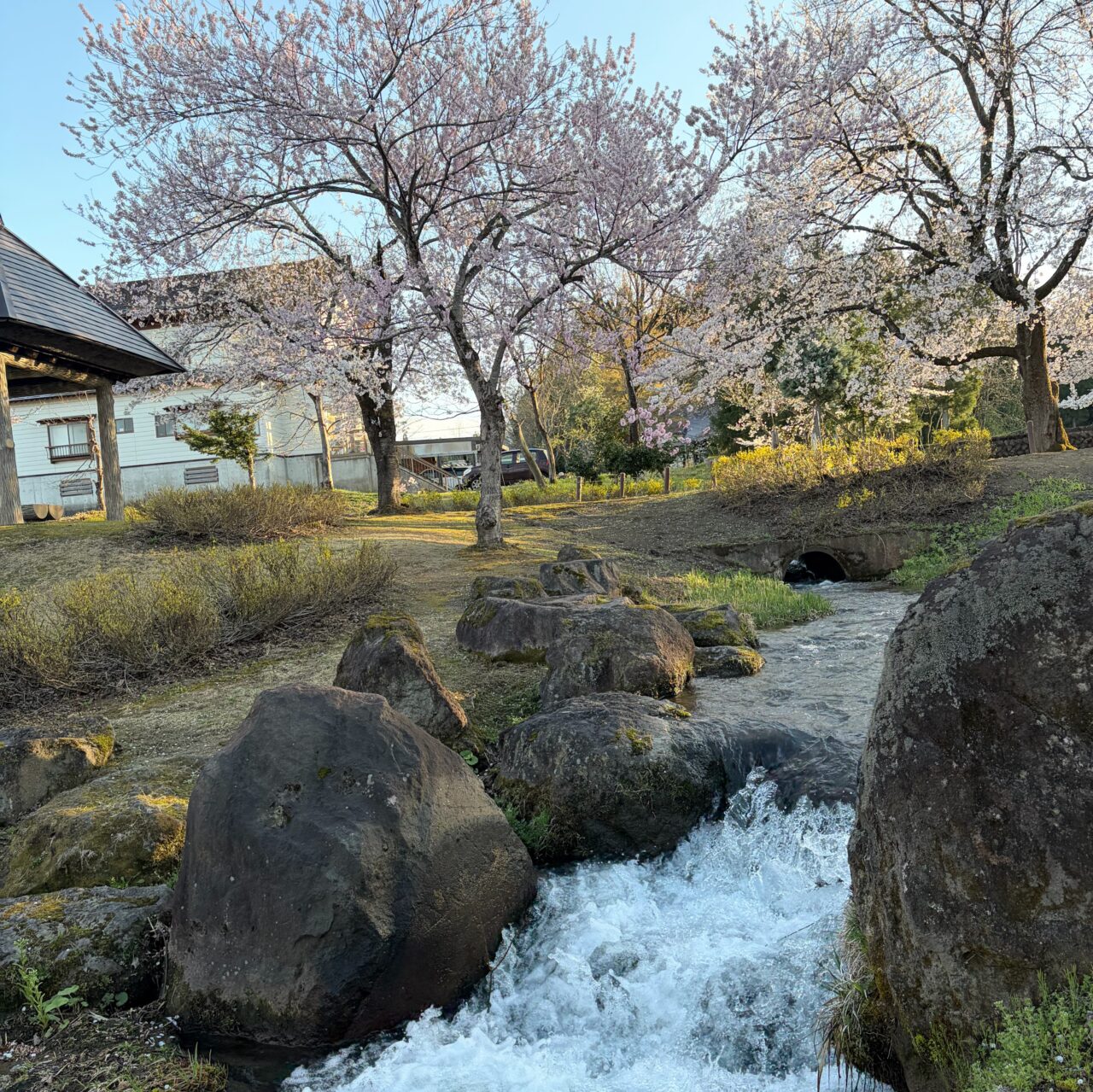 高田城址公園から車で30分ほど、上越市中郷区稲荷山にある「泉縄文公園」では、2026年4月13日現在、桜が見頃を迎えています。満開の桜が咲き誇る園内は、ゆったりとお散歩やピクニックを楽しむのにぴったり! 知る人ぞ知る穴場のお花見スポットです。