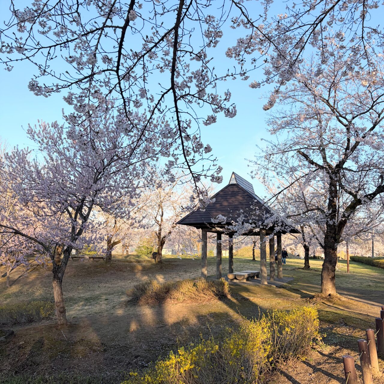 ベンチや東屋もあり、のんびりと桜を眺めながら過ごせるのも嬉しいポイント! 広い芝生スペースもあるので、お子さんの遊び場としてもぴったりですよ。