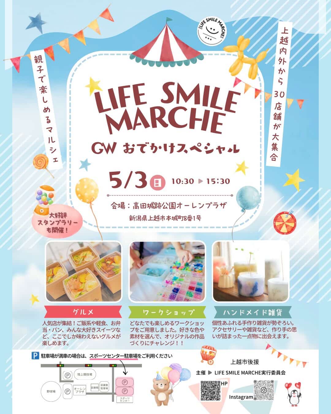 上越市の高田城址公園オーレンプラザにて、2026年5月3日(日・祝)、「LIFE SMILE MARCHE(ライフスマイルマルシェ)~GWおでかけスペシャル〜」が開催されます。
